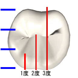 歯の側面から水平にポケット探針がどこまで入るかにより、分岐部病変は以下のように分類されます。(下図は歯を上から見たところです)